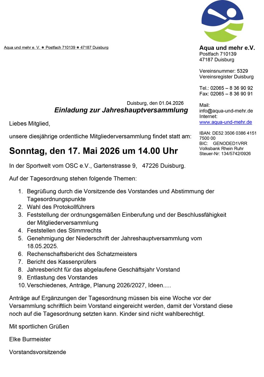 Am 17.Mai 2026 findet unsere Hauptversammlung um 14.00 Uhr in der Sportwelt des OSC 04 Rheinhausen, Gartenstraße 9, 47226 Duisburg statt.